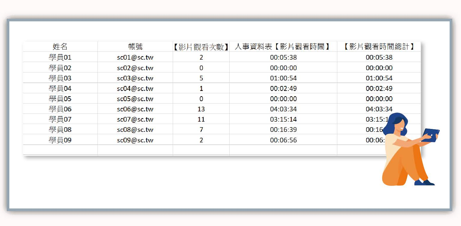 - 數據化成效追蹤: 完整記錄學習歷程、測驗成績、行為數據,提供精準報告,評估培訓效益。
