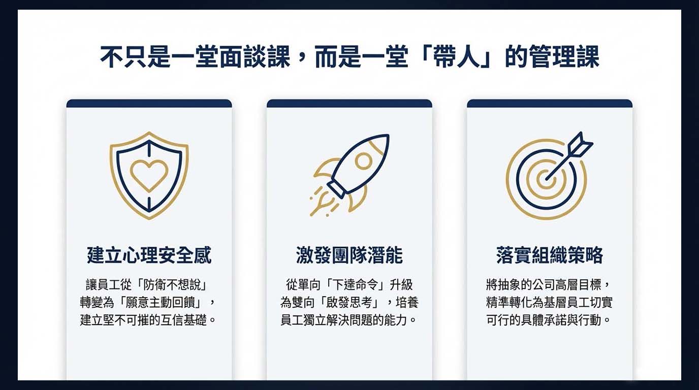 - 提升管理效能:透過有效面談,幹部能更快掌握團隊狀況,避免溝通誤解。